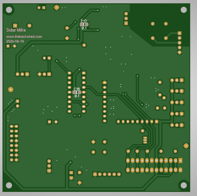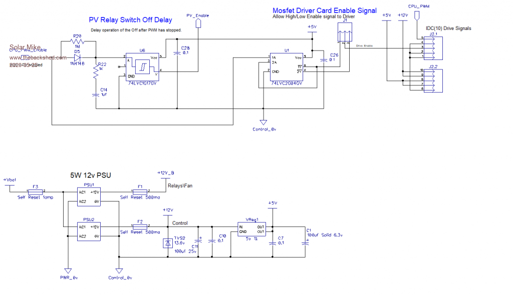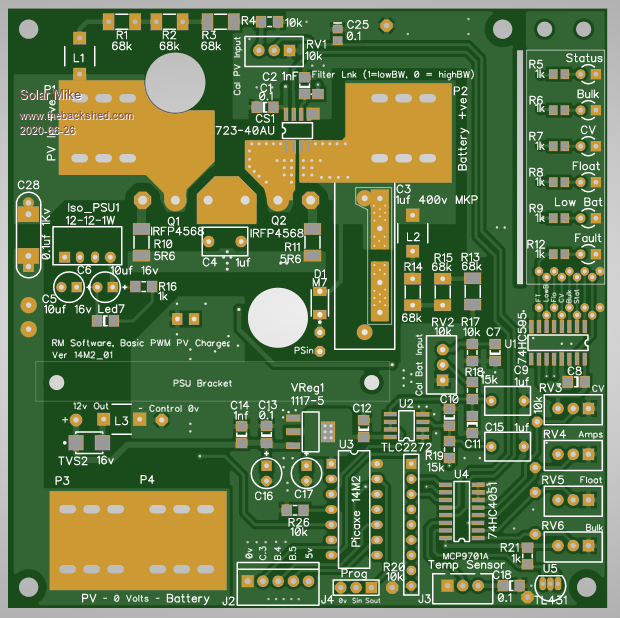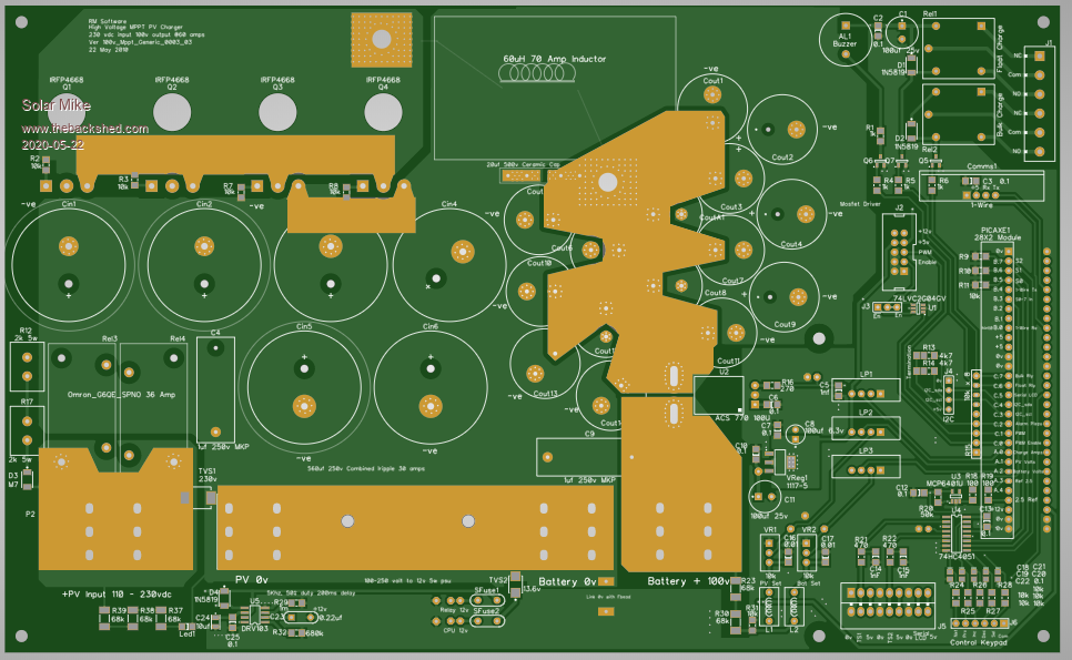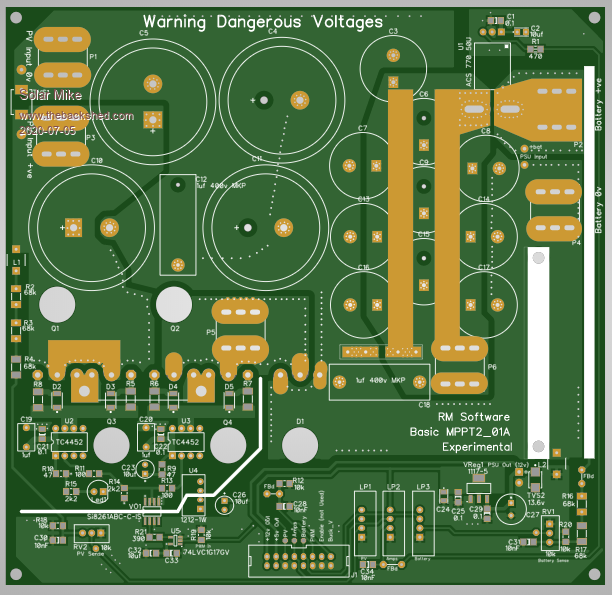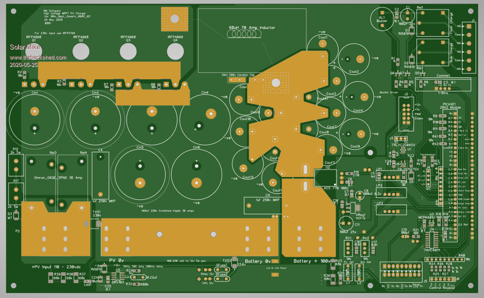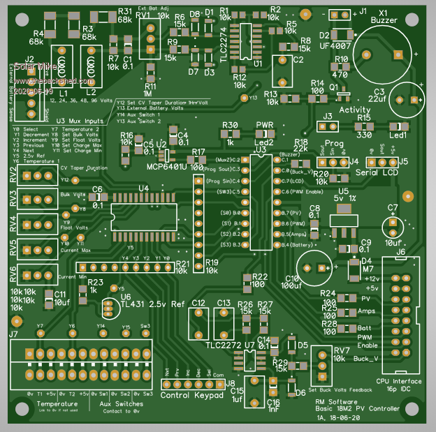 The previous design needed a few modifications to the pcb to fit the extra components, I have implemented a relay for the PV isolation should that feature be required, or shorted out if not. Added modular plugin pcb's for the double pole analog filters and edge mounted cpu card. The mosfet driver card solders to the pcb pins.