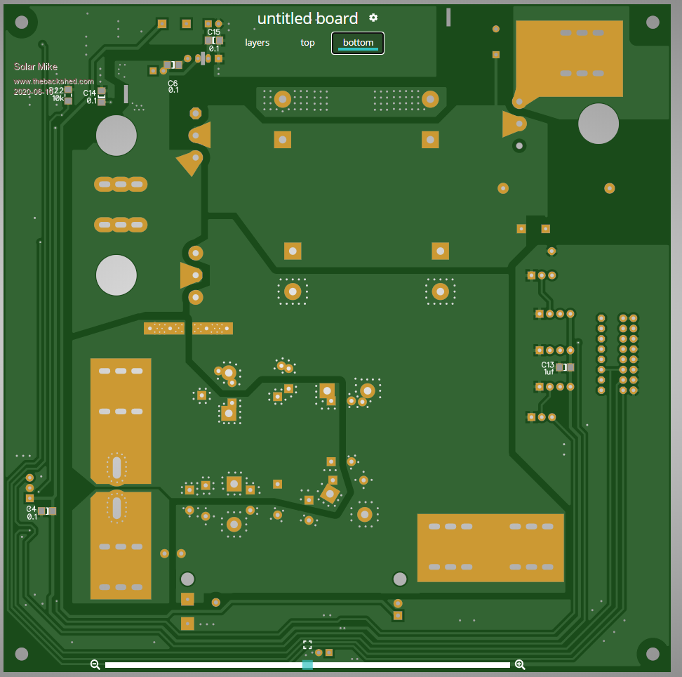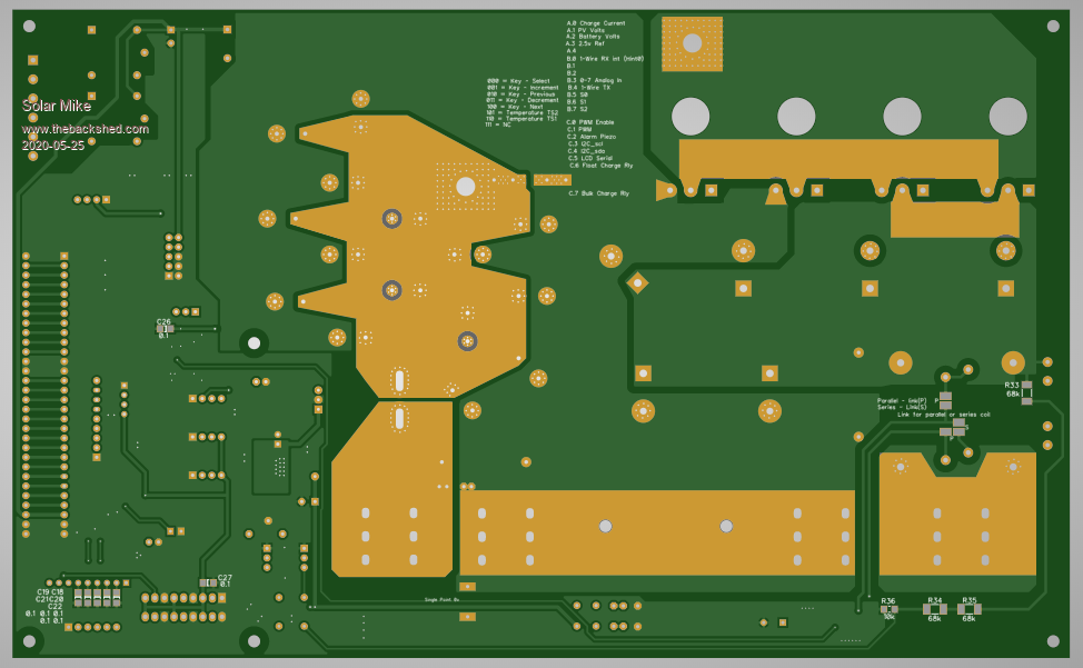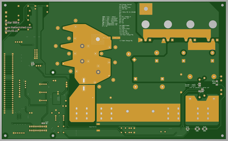 While waiting for boards to come back, have thrown this experimental non-synchronous design together, uses a different switching arrangement of the buck mosfets, so when they are off, there is no self discharge of the battery back into the source supply or PV array, the MPPT module uses the same controller as previous design. PCB measures 167 x 161mm.