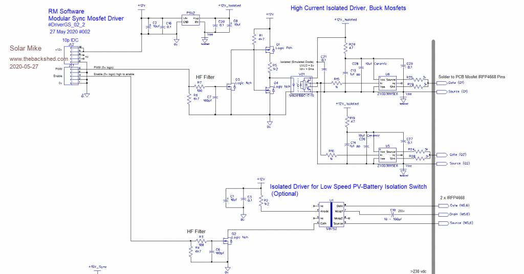 The buck driver section is always needed and maybe used standalone, I have changed the design of this section to use a modern fully isolated emulated opto type coupler driver, Si8261BBC-C-IS    this version of it has under voltage lockout set at 8 volts and low 2.5//4 amp capability, the chip drives dual ZXG3005E6 10amp drivers positioned directly at the gate of each mosfet. The mosfets used IRFP4668 need quite a high gate current to switch quickly and as I have  at least 50 of those tiny ZXG things, about time they were used.