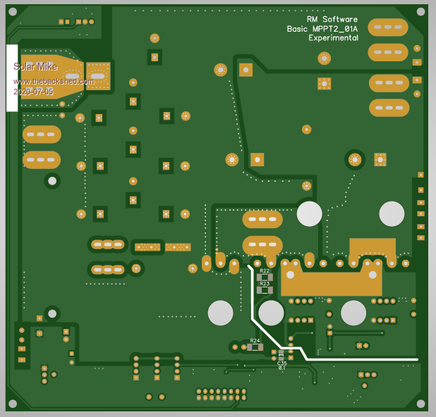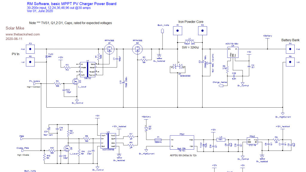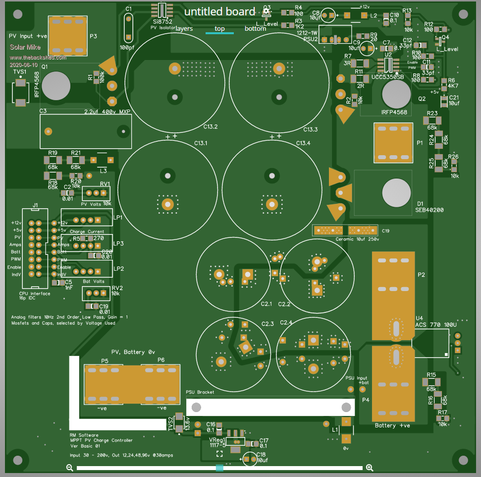 Cool, boards are done and being shipped back... meanwhile I need a couple of smaller controllers that can be used for 12 to 96v battery and up to 200 vdc input at 30 amps charge out. I have a couple of 1Kw UPS units that I want to charge via PV panels; Expect most of the time charge currents will be < 20a, so physically smaller.