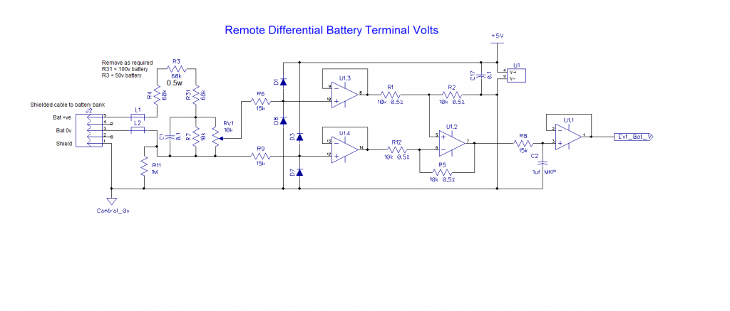 Differential voltage sensing input can be used to read the bank voltage direct at the battery terminals, so avoiding various voltage drops in output cct breakers and cables, required for Lifepo4 banks.