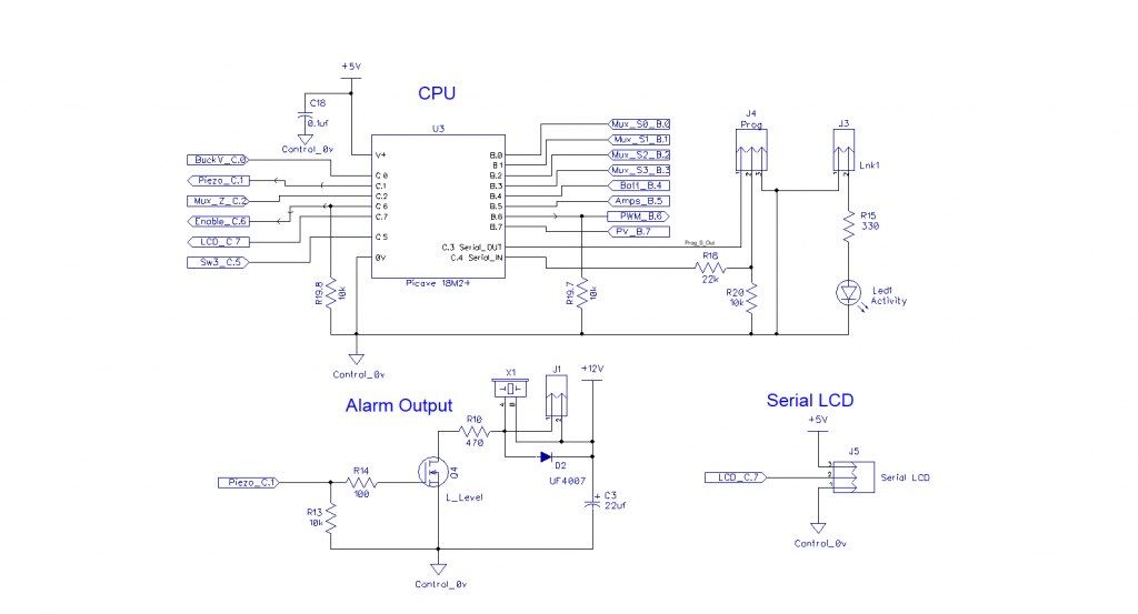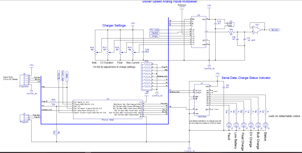 Here is the bulk of the schematic which I drew up to check the pcb layout, not shown are the actual CPU card details or the 2 charge state output relays, reason I have for using the plugin CPU card is to make it an easy exercise to replace the CPU with another, like one of the "Mite family"