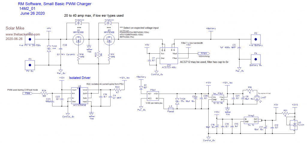 Anyway I have decided the above charger is too large to fit into my UPS units, so that design will be used elsewhere. I want tiny but still 20 to 40 amp range, so have designed this PWM unit using a Picaxe 14M2, fits on a 100x100 pcb, very basic, uses leds to show state of charge, however an LCD display (serial or I2c) can be added via an expansion port.