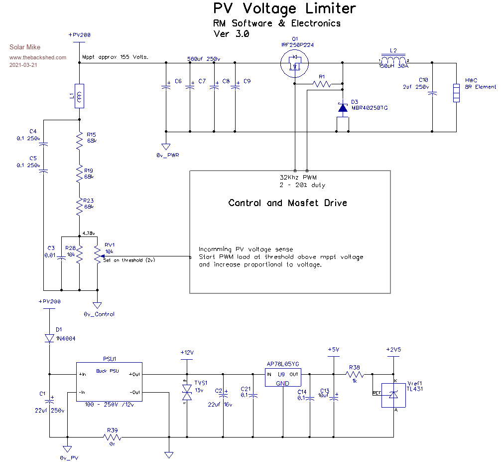 Here is a brief schematic, sort of works in reverse to a standard PWM buck power supply controller in that only the input PV is monitored, if its less than a set point, say 6 volts above the normal expected PV mppt value then it switches off any pwm drive and does nothing. When the PV input exceeds the setpoint, then pwm drive starts with 1-2% duty cycle and increases proportionally to any voltage increase, ie. to prevent the PV voltage from increasing too much, the wasted power heats up the water.