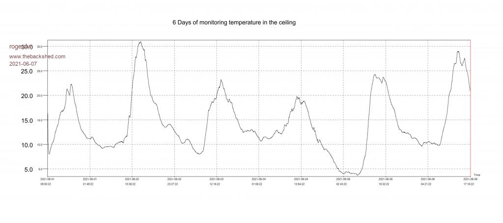 Some encouraging results Dave, well done. I know winter's supposed to be cold and gloomy, but I am surprised how many good days we do get. Cold maybe, but still a reasonable amount of light. The dark days are almost enough to put you off ... but the good days keep you going. They're not the little spacers they use in pizza boxes to keep the lid from sagging onto your pepperoni and cheese? Aaron, since you mentioned the air temp in your roof cavity being worth harvesting, I put a datalogger in my ceiling about 30cm under the peak to see what ours was like. We have black tiles, so would have thought it would be reasonably high. After 6 days I took it out and downloaded the results. Definitely a dead loss for our house. Temps were very poor. ![]() Cheers, Roger |
