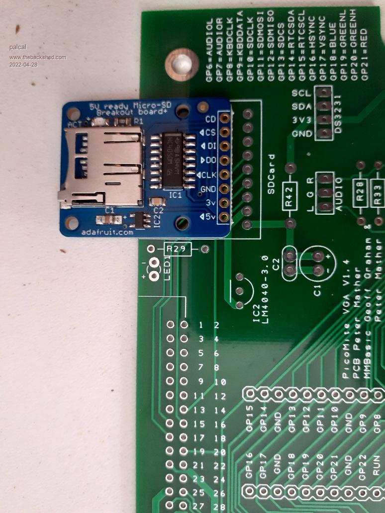 I am using this Adafruit Sd Breakout on ALL my picoMite builts. It works perfectly with 5V directly, since it has own level shift but it also works via 3V3 on the corresponding pin. In my opinion this is the ultimate breakout because it is ready for every voltage. Of course it is a slightly different pinout than the black (3v3 only) version for which the original picoMite VGA PCB was desigend for. So in short: the Adafruit blue version does work, but it won't fit the pinout on the board. Greetings Daniel |