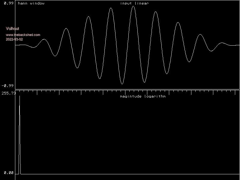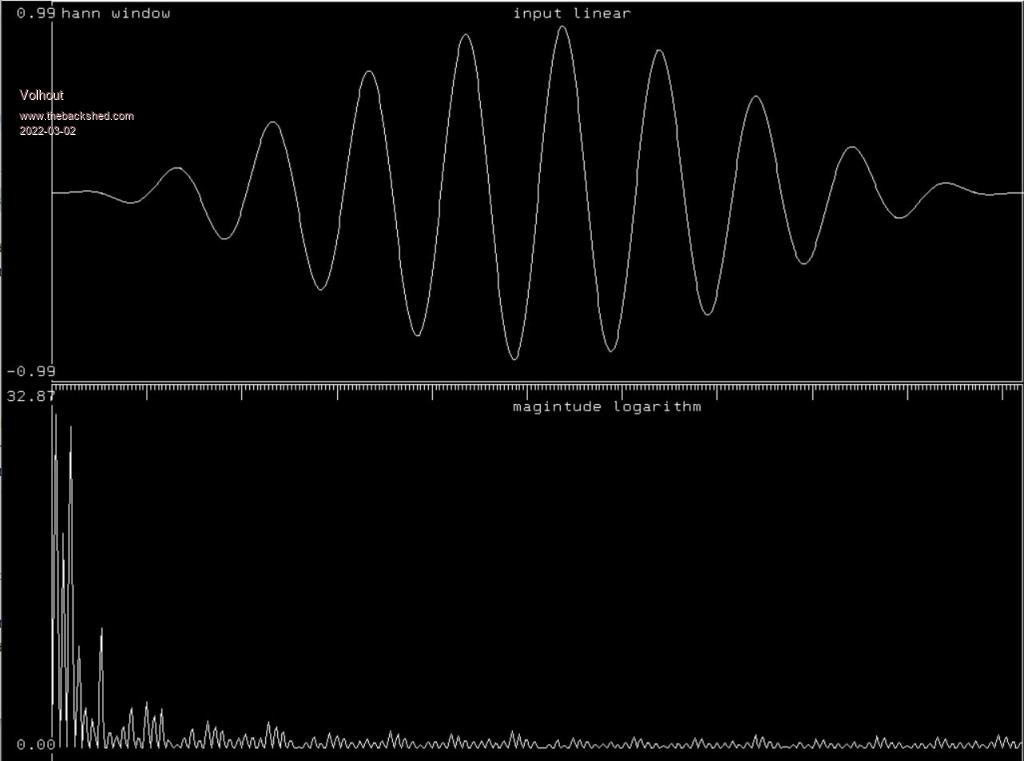 A sinewave times itself makes for rectified McDonalds arches, but squared in height. Rectification because negative times negative is positive. Times a squarewave +/-1 of same phase and frequency also makes rectified mmmmmm's, but the gain is unity and not squared in magnitude. Both the above outcomes have a positive DC component. If the phases oppose, the DC will be negative. If phases offset, the result flips between both signs. DC can be lowpass filtered to measure phase shift. A sinewave times any other frequency makes a mess that low passes to zilch. Over time, all other frequencies but harmonics will remove themselves from the result. How much you lowpass determines how much mess leaks through, but very narrow lowpass is easy. I have almost described a homodyne detector or lock-in amplifier. Except they usually work in 90 degree pairs, so to produce a two part vector. Let's do that. Instead of multiplying sines and integrating over time, lets multiply only by the sign +1/-1 of a squarewave and integrate. Much easier, we only need add or subtract... Now multiply our sine times a bunch of "sign"waves that differ only in period. Just need an array of countdowns and an array to integrate each result. The sine*sine method is kinda like RMS, except we havn't yet taken the root of the mean squares. Sine*sign is plain old average. Probably relate just like they would for a multimeter. Vectors might need slight adjustment to account for that cheat. I am not mathematical and don't know how FFT works. I'm not sure this alternate makes sense or less work. If I were describing the same thing, I would not know. KD5ZXG Fourier transform works on repetitive signals. (google "wiki FFT"). In theory these signals repeat until eternity. If you take a snapshot of these signals (i.e. 10 sine waves) the beginning and the end of the 10 sine waves represent a distortion of the "eternal signal", they are distortions. To minimize the disruption effect of the beginning and end of the snapshot, each sample in the snapshot is "weighted". It's contribution to the Fourier Transform is made more -or less- important. The "weighting" is called "windowing". There are many types of windows. There is a rectangular window (meaning all samples have the same weight), there is triangular weighting (the first and last samples have zero weight, the centre samples have maximum weight. Samples in between have a weight that is a linear interpolation between first and centre sample. If you execute the program in my post, and press "w" a few times, you see a number of windowing techniques, and the effect on waveform and FFT. One of the weighting standards is the "Hann Window". This is similar to the triangular windowing, but samples between first and centre are weighted with a sine^2 function. Play with the program, and experience. Vohout note: the FFT window shows linear magnitude FFT for demonstration purpose (the lin2log function is commented out). Edited 2022-03-03 20:24 by Volhout PicomiteVGA PETSCII ROBOTS |