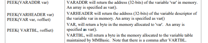 From Maximite MMBasic help page check out VARADDR and their example of peeking and poking that address is here: sample$ = "The Colour Maximite 2 is the latest in a long series of microcomputers." Mind you, this is for the Maximite version of MM Basic and I haven't tried it on MMB4W. startB = PEEK(VARADDR sample$) PRINT " 00 01 02 03 04 05 06 07 08 09 0A 0B 0C 0D 0E 0F" dump startB FOR k = 0 TO 255 POKE BYTE startB+k,k NEXT k dump startB SUB dump(startblock) LOCAL INTEGER k,b,n LOCAL a$ FOR k = 0 TO &h0f a$ = " " PRINT HEX$(startblock+k*16,8);" "; FOR n = 0 TO 15 b = PEEK(BYTE startBlock+n+k*16) PRINT HEX$(b,2);" "; IF b > 31 AND b < 128 THEN a$ = a$ + CHR$(b) ELSE a$ = a$ + "." ENDIF NEXT n PRINT a$ NEXT k END SUB END |