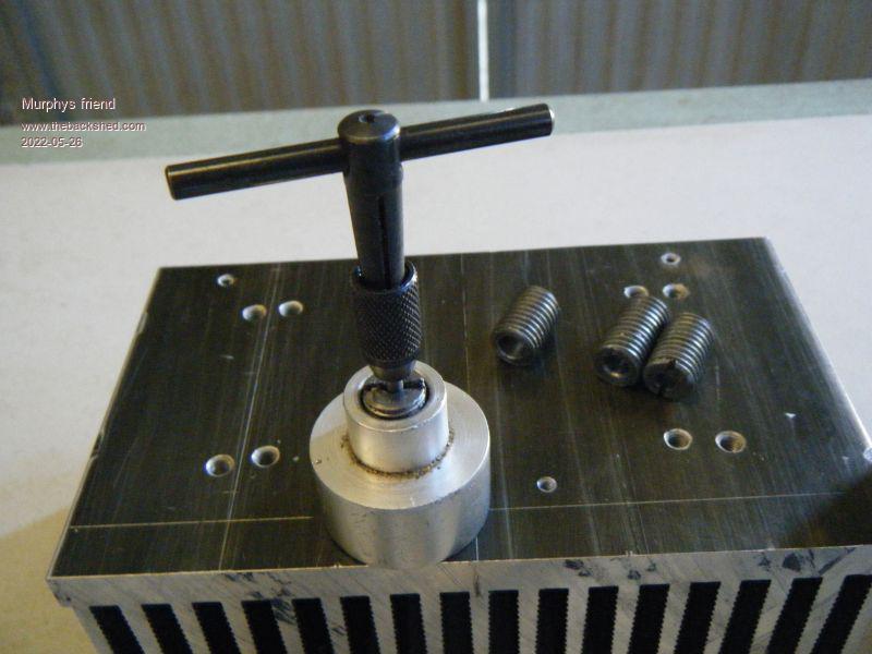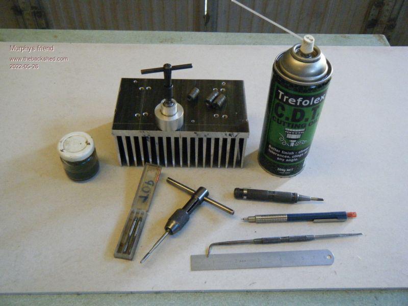 As mentioned above, here are some tips about tapping holes in a heat sink. Its best to use a tap exclusively used for aluminium. If it previously tapped steel or worse, stainless steel, its no longer sharp enough and jams much easier, risking breakage. Marking & drilling the hole precisely is very important as often the part fitting (PCB, Mosfet) has to line up. My PCB's are laid out on a 100 thou grid so I use a ruler with 20 thou markings - not metric! First I use a clutch pencil to draw crossed lines where the hole has to be. Then I use a scriber to pin prick the exact center. After this a center punch aligns easier with the pin prick mark. I prefer those 'automatic' center punches as they only need one hand but the old fashioned one also works as long as the point is sharp. ![]() The picture shows what I use. The tap needs to be lubricated, for aluminium kero is recommended but I advise NOT to use that in blind holes. The reason being the kero washes the swarf down the hole and when the tap tip gets there it jams. So I use Trefolex with blind holes. The swarf sticks in the grooves then. The little jar in the pic holds kero. The tap wrenches shown are IMO better than the ones that usually come in a tap set as the shorter handles restrict the torque and reduce breakage. In my experience a tap in aluminium most likely breaks when it is backed out so, if it jams, be patient and turn the wrench slightly back and forth until its free enough to remove. For blind holes it may be better to use the tap set with 2 or 3 taps, applied in sequence. For thru holes less than 6mm deep the taper tap is my preference. The tap guide shown is well worth while to have (mine was made from an old floor mounted door stop), it has inserts for different size tap shank diameters. That tool guarantees a straight tapped thread .For deeper threads I turn the wrench 2 or 3 times and then back it out completely to remove the swarf stuck in the grooves. Repeat until tapping is complete. This sounds slow and tedious but boiling out a broken tap is 1000 times slower and ruins your whole day. And its often not possible to drill and tap another hole next to the broken tap if something that cannot be changed fits there. So, patience is the word when it comes to drilling & tapping heat sinks. ![]() |