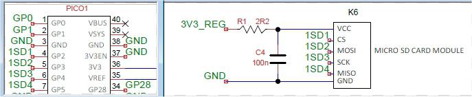 Mick--what is the purpose of the 2R2 resistor at R1 (power to the SD card)? I didn't have a 2R2, and after looking at the circuit, I just inserted a Dupont wire with pins on each end, not soldered, and the SD card worked. What am I risking if I just put a link at R1? PicoMite, Armmite F4, SensorKits, MMBasic Hardware, Games, etc. on FOTS |