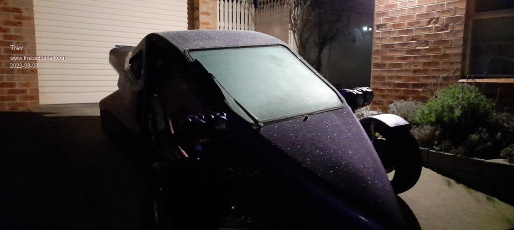 Intended to leave Sister's place at 5.30am. Closed the front door which automatically locks. Walked to T-Rev to find plenty of ice. Tipped water on screen which solidified too. 1/2 hr later after scraping the ice off with my glove, I drove down the driveway and fog/ iced over again. Several attempts got it ok to see through. ![]() At one point the ice just would not stay off. As soon as I wiped the ice off, the fog solidified again on the windscreen. Just had to wait for the sun. ![]() Charged at Goulburn ![]() My EV journey is over. 50km south of Sydney. I stopped to check a noise in the back wheel. While looking at the back wheel, a truck ran into the front right hand side. 100-110km/hr. Never stopped either. ![]() ![]() A real life test of the body strength. It did not get the front wheel/ swing arm assembly off. Trev @ drivebynature.com |