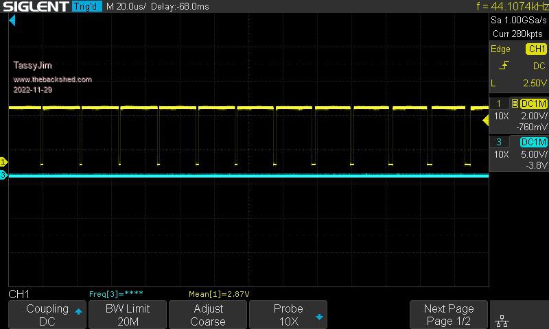 What you are seeing is the pico setting the no-signal level to VCC/2 to avoid the clicks when audio starts/stops. ![]() 44.1kHz with the duty cycle changing to give the audio. I think you do need to filter it to minimise the 44.1 kHz. Jim Edited 2022-11-29 11:57 by TassyJim VK7JH MMedit |