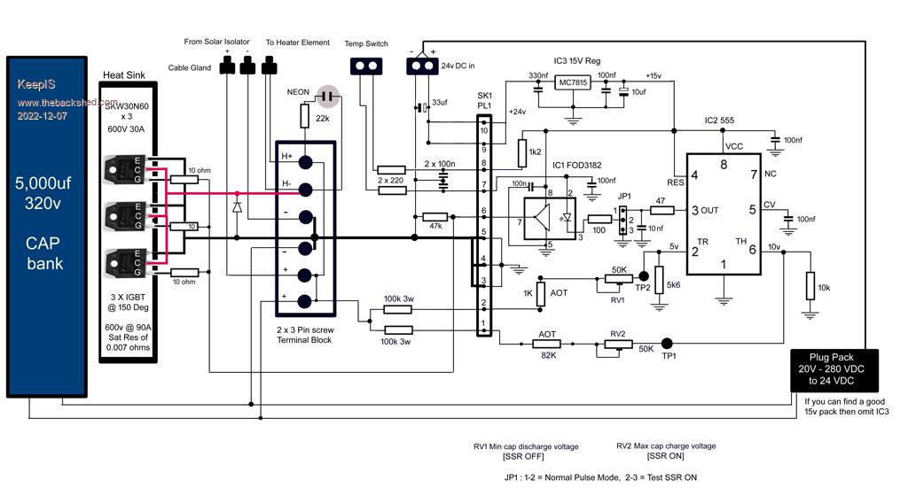 Another stinking hot day in paradise, I moved the HWS controller and Solar Disconnect switch out of the weather and under the pergola, so much nicer for me to finalize some tests. First off, the FOD3182 High speed MOSFET (or IGBT) gate driver IC. Some may recall the RF oscillation I was encountering with the 555. This morning after the controller relocation, I noticed that the IGBT heatsink (SSR) was getting hot and the FOD3182 IC was stinking hot. Once again the only rational explication was some kind of RF on the switching line from the IC to the SSR gates (again). Grabbed the CRO and was greeted with a band of RF noise swinging 0 to 15v instead of a PWM square wave?? Turns out that IC1, the Opto coupled Gate driver, has lots of gain and can oscillate under certain conditions, hence that NOTE in the spec sheet requiring a 100nf connected directly across the supply pins of IC1, which I had ready have installed. The fault occurred ONLY under certain load conditions. I found that IC1 is very particular about the Cathode (pin 3) ground connection location, so I added a 100 ohm in series between Pin 3 and a 10nf to ground then a 47 ohm going to pin 3 of IC2, the NE555, which is, in this case, the comparator controlled output of the 555, this pin pulls the Cathode of the Optocoupler High [off] or Low [on]. I’ve thrown everything at it and it finally appears 100% stable - I really worked it. In the revised circuit, JP1 sits between the 555 IC2 and the OptoCoupler driver IC1, Pin 3 of both ICs. JP1 allows me to turn the OptoCoupler Driver on and turn the SSR hard on instead of having it Pulse, I use this for testing and comparing power output. ![]() Following on from the tests carried out yesterday This morning I set the low cut off trip to 150v - Results: (A) The Pulse discharge time reduced to 98ms down from 135ms (B) The charge time reduced from 200ms to between 50 to 60ms (c) The Pulse rate around 7 times a second. The Pulse now discharges from 220v to 150v, and is now in a fairly linear part of the decay curve. Quick and dirty: Say the averaged voltage in the Pulse is around 187 volts. Then it looks like the Avg Pulse power is 1.46kw delivered for 100ms every 50ms or so into the load resistor. An initial test I did yesterday evening with a 24 ohm 100w resistor as the load, carried out in poor solar conditions, revealed something very interesting. With the load directly connected, it pulled the panel output down to 20v, so not much happened. Connect the controller and it still managed to pulse once a second, in around 4 seconds the resistors were too hot to touch, a few seconds more and the traditional spit test resulted in the boiling evaporation some of us know all too well. The Capacitor Bank may actually be working harder as they are operating at the peak discharge part of their cycle (MAX CURRENT) many time a second. To little capacitance and the current / power into the load would be limited, to much cap and the charge cycle would be extended greatly, and to a lesser degree, the discharge time, all resulting in a lower repeat rate. But keeping it simple, as size of the solar array increases (Power) then it would be advantageous to increase the size of the Cap bank accordingly. I notice with the higher repeat rate that the SSR Heatsink runs warmer - higher peak current so higher power. Looks like the seemingly slow repetition rate is not a hindrance when the pulse power is delivered to a Load that holds the thermal increase without cooling between pulses - a thermal bank - a well insulated HWS, especially once it starts to get warm, seems like it has snowball effect. Thought or Errors?? Hope to do more tests later on today, I have to watch the heat at the moment just in case. Mike. Edited 2022-12-07 14:54 by KeepIS NANO:Inverter V 8.2ks -Â Linux AvrDude GUI script V4.1 |