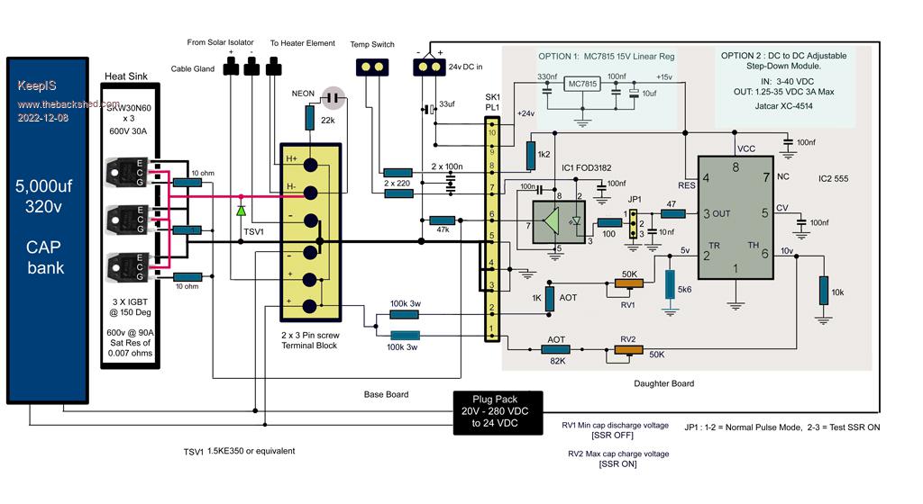 I notice that the Discharge time of the CAPS into the element is varying between 35ms and 55ms. This is controlled by the R/C TC of the Restive Element and CAP bank Capacitance and the HI/LOW voltage trip points of the NE555, so I decided to have a look. To start with, I eliminated the chance of excessive loss between the Controller and the HWS Heater Element. Measured straight across the Heater terminals in the HWS with the Scope and everything was exactly the same, and the element resistance never changes. The 555 and driver supply is absolutely rock solid, verified with the CRO. There are ZERO current paths on the control circuit board [daughter board], all current paths are located on the Base Board, and all IGBT positive and Collector switching paths are at the base of those two BIG green connecting blocks. So I believe that the NE555 trip point is being triggered earlier or later depending on how fast the charge rate [voltage] is traveling as it crosses the trip points, and a higher Panel output power would mean a faster turnaround time after crossing the Low trip point [recharge time], I had noticed the voltage points moving a bit between different tests that I've done over time. Anyway, it's working great so I'm going to leave it be. FYI: New Test to time the heating of a measured volume of water to 60deg from the same base temperature. Device in use: 2kW Jug. Overcast dull light. Time 4pm. Tested with the Controller first, it took 5.53 minutes to get to 60 deg (only 2 pules a second). Refill for the Direct from Solar test. I cooled the element down first but any heat left also favors this Direct solar test. After almost 6 minutes the Jug temperature had stalled at 36 deg for almost a minute. Light level was dropping and I switched to the Controller, the water temperature immediately started to climb, 4.20 minutes to 60 deg despite slowly fading light level. This jug has a blue LED light in the base, in direct mode it's very dim, in Pulse it's a very bright flash for each pulse. Even 2 Pulse a second are enough to slowly heat water to boiling, and it never stalls, it just keeps increasing the temperature, that's the difference between a few hundred watts direct (or a few watts in low light) and a slow (in poor solar conditions) repetitive 1.5kW energy pulse into a thermal bank, at the same time the controller is still keeping the Panel output around the MPP area. To recap, it's now been a week off grid with this little Solar Hot Water system - I'm going to double the size of the Panels in a few weeks and then see what I can get out of the Big HWS, might just be able to heat it in summer and use the little one for winter if needed, time will tell. Cheers Mike. NANO:Inverter V 8.2ks -Â Linux AvrDude GUI script V4.1 |