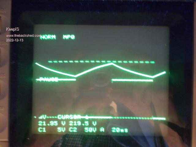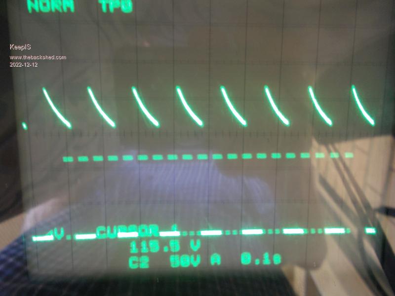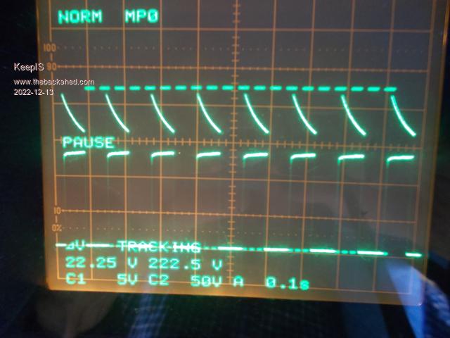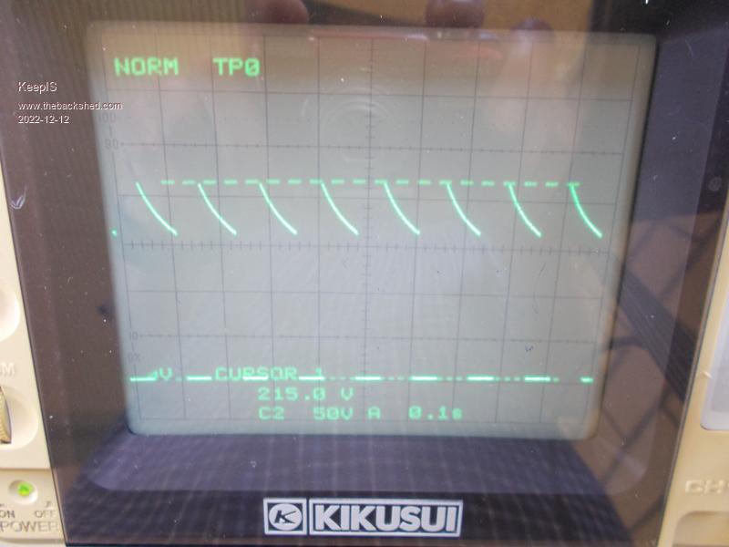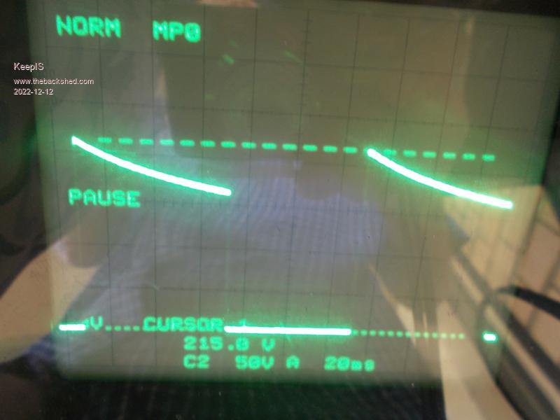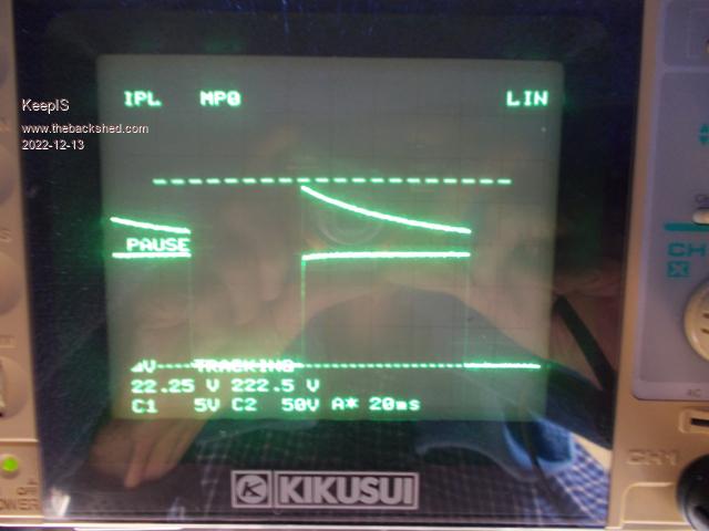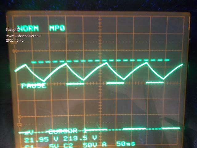I thought I would finalize the Digital Scope information: I've added a basic description of the waveform for anyone not familiar with a CRO (cathode ray tube oscilloscope) which this digital storage scope that I'm using IS. I have the Panel and Cap-Bank voltage waveform on CH2 [sawtooth waveform] with the Gate Drive PWM signal [square wave] on channel 1. Note: The gate drive volts is shown as 21.95v, however it's been referenced to the base line, not the the elevate cursors of CH2, it's actually just under 15v and is measured directly at the base of one of the IGBT devices after the 10 ohm gate resistors. The leading part of the sawtooth waveform is the charge time, the trailing part is the decay [discharge] time. The waveform is synchronized with the Gate drive. Zoomed image - Charge cycle is in the middle. The following is the CAP Discharge across the heating element [CH2], and Gate PWM drive [CH1] Zoomed image. FYI, the slight roll off on the leading edge of the PWM Gate drive signal is a result having the PWM probe running without a ground clip. Reason? The Probe for the Element is connected ACROSS the Element connections, so the earth on that probe is effectively connected to the Cap Bank positive [220v], the probe earth clip is connected to the collector of the IGBTs. A slight interaction with the PWM probe but not enough to make me bother to adjust the Probe compensation. Mike. Edited 2022-12-13 11:37 by KeepIS NANO:Inverter V 8.2ks -Â Linux AvrDude GUI script V4.1 |