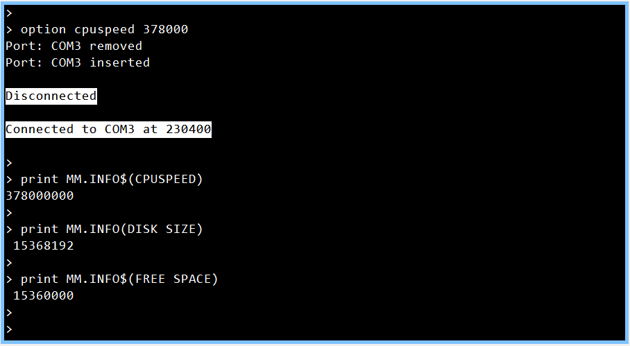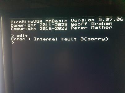 I have upgraded a PiPico VGA to firmware release V5.07.06 and loaded the Mandelbrot program and all went well until I tried to raise the CPUSPEED to the higher value as mentioned by Peter at this point the Pico crashed. I power cycled it and to check if the program was still alive I typed EDIT and I received the following error message: ![]() I reloaded a new uf2 file but now the unit rebooted spazmodically a few times and now is bricked. Any clues? OA47 |