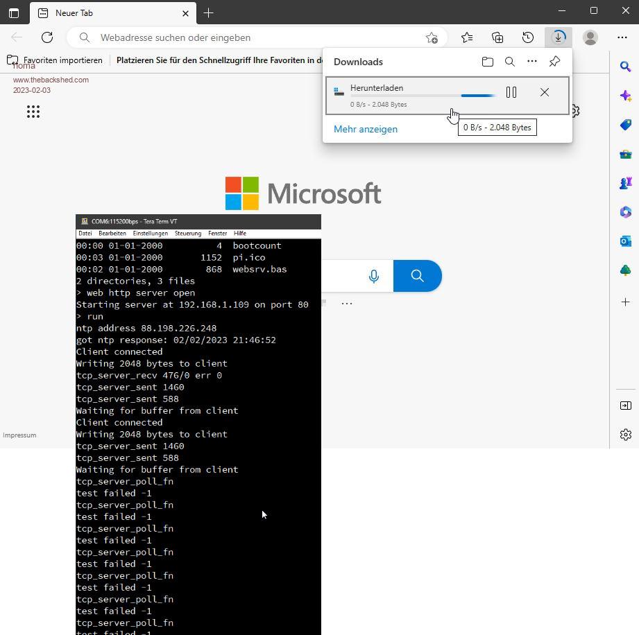 okay I could not wait until the weekend :) > Connecting to WiFi... Connected. PicoMiteWeb MMBasic Version 5.07.07a1 Copyright 2011-2023 Geoff Graham Copyright 2016-2023 Peter Mather > web http server open Starting server at 192.168.1.109 on port 80 > when I start the webserver and then access with ncat comes weird stuff? C:\Users\homa>ncat -n 192.168.1.109 80 ¢/í¸┘h¶┘<¿5ÕÅ*═┬@┴¤Rqjr)#░[*éêD↓0‗kú«ä═IÍâB↨þú9ôsãµ±è■!↓õuÄãçàX¦$µØ]D@ïZ#^®´ý?æ£zA↨↑rÙ♠‗毩l¥┘4¸4#♠z3pùÎR↕§~Êöòf♠#Y‗o·þý®µ½¬9┐║_Ñ▒«$üaèxEõ<Gx9GÃØ┘J»a↨;¢j§ðD[æ═_u_A©ı8■ÏZ▒/F╝Ä5*8╠*»»båuUt∟pú Ò_¥│¶z'X'k►Ï▒►Ü«8äÍ çUzúu5┐>qlä'w┴Ð┬Óûe dmt ]ç`ÌÀ]ïä6Ó╗┐ùàó ┴ZH∟╔┼ëiʬ2¤q╚ζQó♠ì↔═Ý╔·╔↑W♣g²ëöÛS¢ D▄Ñ ıúLÄöôí$t═→♦úA ↕OBÿ╦s÷¨T│ÈýÁ▲éVc{`º¬¼ßõ8Mf:▲ÀP¬g8Ó¯ÂfîGâ├d├ )╚o▀x♠©ä◄îü→È-4¬h¼vrüçï+Z/&¥Ìý┐8¡░▀ú ró*L«wÃè┐}┼▼Ã↑D↑ý_f±£j└Ï0MO:►└Í{ax,Ô♣Î,ä╔¬Ï--▒áÔTú═♠☺c‼o►ëDûM´┬d‗┤G×Ç]wâB→↓×↓¨¡NÒ→►U┐êSÅê³►:ŹéSå↕^ 2╝♠Ȱ └¤►È↔5·╬N-↨☺xÃ÷♣î(®ì;¾[¬¾W♦ä¿~s~ÁÐ!]5Ù)P┴X♠´.DÆz↑╗BÂUtÁ è╦ZHè┘c»¶ Iç╗├çëEIÇþ▒ÃY╔Q ëÐ¥Íû‼ÿ_³■Ú!╬¢YoB@┼FHI$qÝs"×↨Û@säû►»á┤àH«Ñj♠↕L§@│ÚWQïsÀã½│╠╗■Î9Qhm╬]áZ÷ð«▓?o╬ o>kï+!▀*a╚;×gçÆ¯→Ê é¶1ø÷'A5¡Úà▬ÙE´cÐÑáÔ2& Qåêï¾→B«£Àu┼§H┐ÆìY‗sBÁÿ▲îëoYò$├└rq█Q@dXN¥¶▀ÀóåØK┤☻ìÂÊÐ♥ÌW¶┴☻õÃ6rıuºïKM ù╠ä0½▄×ä»;◄a╔èÝ´ôñ╠↔*¢Ò Y→{ÀéÃ♣¹→ÉOéé╩Ö2m┤i#q▬ñ8´1jbï┌¶Ô²♣ú▓║ñ"+ÿf6│Ò¶ñ¬♥^JtË┤░jï♣↨→Ƶ┘ÖªrM£R³YA∟▲äS=BíÛ¸♣↨ƒ╚ß²B½+íÅã×╦(Ý-╠▲°‼┌þ3■qü¹├nòKæj∟æ‼Ñâ?¹│1ý╝ެú®┴ÒH↕C→{P/LuÅ3.²±J) Ë┌I╗Þ´F¢Ú7V&=↓ÀoëNÉ┐¶U[│Û▬NåSn(Õ↓=jö↑┘╣(│i{█ "!õÏ∟A│_³Ó6fBÝ╗÷â>Yè→P¨Ia‼░¬OJ│]╣§k6¥d6èÂâ╝x☺VÁB²ƒÔB¡ðØD^Äd7Àç]*Ê┬╔^┌Þû^┬▒b*°úÚè;─RI?`< ñ▒]×)ñKð ┬²e)z¦N¥n¬ÂÂbÚ»♦7£¬├▬`Z┬'¯┬¤4♥{P±©│▼´¶çX▄ ÐN╬üaWuï¶´È~ò─ѧkaBc¡Ýª▼▒╔▓pt[ BP*<\þ┼♥6bw├6╝UB↨MQ¨uÜ´¨|Õ→BntX£hE↔»ú}ò¬ ù¯59N╔`xÇ┼±.E│g↕$£^♦©çÖbÐ═↑Ï└ !}m▲K©!U;ZW³×i‼iòWÂ█f‗Ûdw┌┤kKA2↕o│ª¨ò¯☺4╗Ì►ì►▓Áæ■┤gæþ°♦êpè─♦LÙÖ‼I¶b░¨ÈÆÄéÄ3g▒;Aúÿ↕÷↓fIàI■¤o¶╩ô↕╗£ôÑÆöKÀùxpá┘i.→ ¾Ó│☺ÕÔ§s╚ÍïC¦qõ3=║X>qá↔┘┴[ÝÿAîλzÛQ± ☺.΃¤▒┴G¦·¼é╚U«µ─7|╔K¸)ò▄}¿ı♠3¿SéyòºÆ©HOu☺{BamD░,Èk±ýg"►GÙÔZ↓ú╠■õ]©mò% X┼¨╠ÀaÚ█m↔N┴í┐↑Ëd@5↔J ÞíúJ─î▲=fj☻ryb♠╦%¯²½§'ö¢Ôp&Û↓U│Ú╔·¾8á|µQı╠B3W if I call the ip in the browser opens the save as dialog?! in this file is also only grit. do you have any ideas, matherp, about which commands to implement and how? it would be helpful to query the ip assigned via dhcp with a command and or on startup after Connected: <ipadr>. Edited 2023-02-02 07:32 by homa |