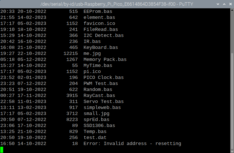 Yes same here, it will list a full page worth of files and crashes with "ERROR: Invalid address - resetting" on the key press to continue listing files on the SDcard. ![]() Hans ... ![]() Edited 2023-02-15 14:26 by Hans |