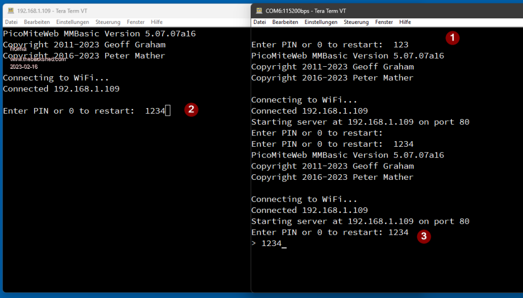 @peter, hint for a glitch: to protect the Telenet console I tried to set OPTION PIN 1234. The incorrect input via USB leads to a reboot! (1) But when reconnecting via Telnet no access with correct PIN works! Also restart! (2) Only with access via USB and correct PIN I get back into the Picomite. (3) ![]() |
