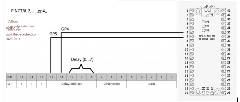 Peter, Something is not Okay with the PIO assemble when using a mix of DELAY and SIDE SET (unless I am mistaken). PIO assemble 1,".program NES" PIO assemble 1,".side_set 2 opt" PIO assemble 1,".line 0" PIO assemble 1,"PUSH [&b01,7]" -> 2 side set pins should be &b01 and delay 7 (&b111) PIO assemble 1,".end program list" This should assemble to 100 01111 0000 0000 = &h8F00 ssddd s=side set, d=delay ![]() But it assembles to 100 00001 0000 0000 = &h8100 ???ss (delay field is filled with side set information, and side set field is empty) This seems also valid for other instructions that use side set. I also tried without the "opt" parameter, but that does not change. Volhout Edited 2023-04-11 19:57 by Volhout PicomiteVGA PETSCII ROBOTS |