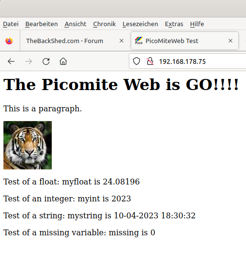 Hello, last easter days I played with WebMite and wanted to see the web-demo running showing the tiger, but I did'n succeed. I saw the webpage and the values, but not the tiger. The firefox browser was constantly spinning as if the transfer had not finished. I modified the demo a little and found that the lion picture "small" needs a "/" as prefix to show up correctly, stop the transfer etc. Now it runs as expected. ![]() And here is the modified program: ' HTTP Host Dim buff%(512) Dim myfloat!=24.081960 Dim myint%=2023 Dim mystring$="The Picomite Web is GO!!!!" WEB ntp 2 ' Germany = +2 hours summer time Do poll Loop Sub poll Local p%, t% For a%=1 To MM.Info(max connections) LongString clear buff%() WEB tcp read a%,buff%() p%=LInStr(buff%(),"GET") t%=LInStr(buff%(),"HTTP") If (p%<>0) And (t%<>0) And (t%>p%) Then s$=LGetStr$(buff%(),p%,t%-p%+4) Print "String is ",s$ EndIf If (p%<>0) And LInStr(buff%(),"/small") Then Print "sending picture" On ERROR SKIP 1 WEB Transmit FILE a%,"small.jpg","image/jpeg" ElseIf (p%<>0) And LInStr(buff%(),"favicon") Then Print "sending icon" On ERROR SKIP 1 WEB Transmit FILE a%,"favicon.ico","image/vnd.microsoft.icon" ElseIf (p%<>0) And Instr(s$,"HTTP") Then Print "sending page" On ERROR SKIP 1 WEB Transmit page a%,"test4.html" EndIf Next a% End Sub Many thanks for WebMite!!! Hope to get the manual soon -andreas Edited 2023-04-11 05:23 by andreas |