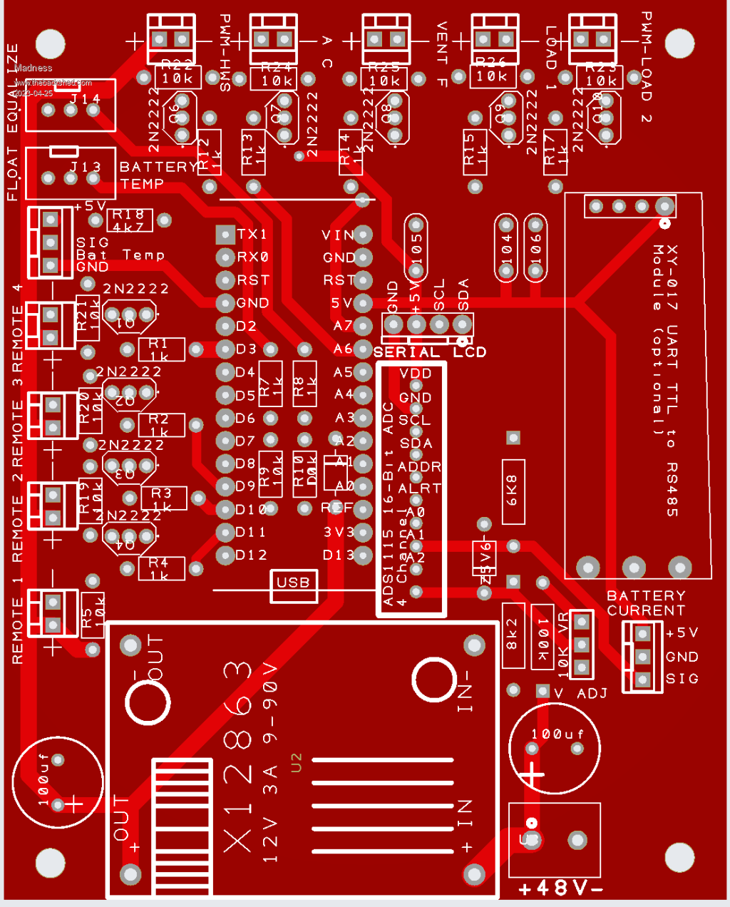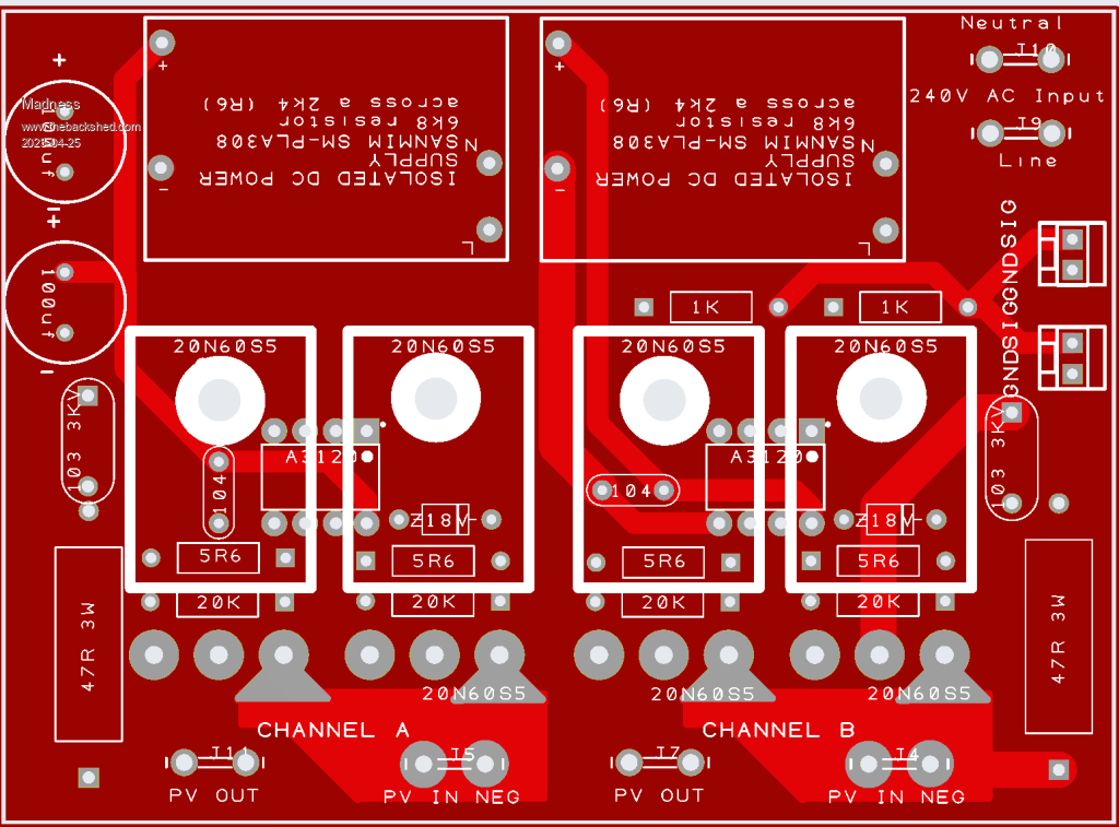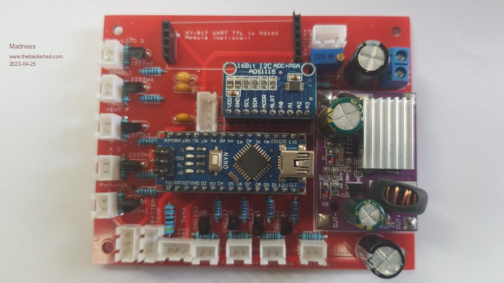 So I was on the right track then to correct the voltage? I have spent quite a bit of time working out what each line of the code is doing and adding comments to try to get up to speed with what the code is about. The small test rig ran most of the day nicely with nearly 1KW at times produced by the GTI. The single toroid and heatsink got to just over 30 degrees with no fans and an ambient temperature of around 25. I made up this AC current sensor setup to use as per the hack. ![]() The Nanoverter control card is now fitted to my new inverter. But something is not right, I have no control over the AC voltage in this inverter, it sits on 232 and does not change. the waveform is slightly distorted just after the peak on the bottom side while the top is perfect. It was running perfectly with the Murphy version of Nano1 code, so I am thinking the changes you have just posted will sort that out. I will give that a try tomorrow, I have had enough playing with inverters for one day. Here is a new GTI regulator that I have made. ![]() ![]() This does not have any MOSFETs on the master board, I have moved them to inside the GTI so the high voltage DC and AC all stay sealed up in the GTI. ![]() It just uses a 12V PWM signal from the master to each slave to regulate the DC input within the GTI. I have 3 GTI's running like this, there is a battery current sensor to keep the battery current under the limit I have set. It first turn on my hot water if the current is too high then if needed it will reduce the GTI DC input as well. Edited 2023-04-25 16:44 by Madness There are only 10 types of people in the world: those who understand binary, and those who don't. |