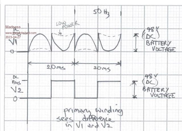 The modulation method does make a difference, the only person I am aware of that has a GTI working but not properly with standard Nanoverter code is Murphys friend. A GTI will connect no problem using the standard Nanoverter code as long as there is more power being used than what the GTI is producing. In other words, it will not backfeed, to backfeed the inverter needs to act as a rectifier and a boost converter. The Primary windings in our inverter transformers are set up to work at a voltage much lower than the battery voltage. This is so that as our AC loads increase the primary voltage can increase to maintain a constant AC output voltage. What I believe is happening is that the unipolar modulation shown in the bottom diagram above is only connecting battery positive on one half of the sine wave and then only battery negative on the other half of the sine wave. Bipolar modulation connects both positive and negative at the same time, this is similar but not quite the same as the EG8010 modulation. If you watch the video I have linked above it goes into a lot of detail about the 2 types of modulation. So why not just use the EG8010? That is because we can not sync the EG8010 with a generator and this is why I am experimenting to find a way that I can sync a generator and back charge with it. Another possibility is getting the Nanoverter to use the same modulation as the EG8010 but I don't have code for that at present. There are only 10 types of people in the world: those who understand binary, and those who don't. |