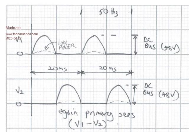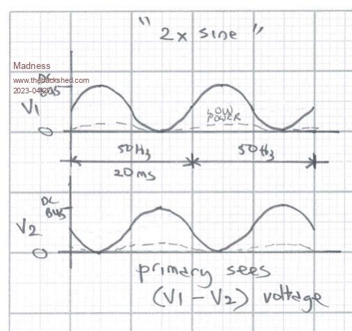 Madness: just a detail on the 2x Sine modulation that needs to be cleared up. In the above diagram I show incorrect "low power" voltage traces. The incorrect trace has them close to zero DC volts. The CORRECT trace should have the voltages close to 1/2 DC supply volts with the small amplitude 50Hz deviating from that mid point location. It results in the same voltage difference (V1 - V2) With zero modulation amplitude, that is, at the start of the soft start or the end of the soft stop, both V1 and V2 will be 1/2 DC Volts. I just wanted to correct that error now, since it looks like more interest in the 2x Sine modulation is happening. wronger than a phone book full of wrong phone numbers |