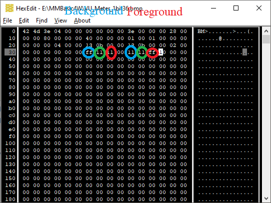 The BMP format supports 24 bit background and foreground colours for 1 bit / pixel images. Most viewers, including MMBasic will display them correctly however most editors only allow black and white. You can use a hex editor to change the relevant bytes to get any colours. Hex Byte numbers (starting from &H00) Blue Green Red Background 36 37 38 Foreground 3A 3B 3C Values can be 00 to FF ![]() ![]() Edited 2023-04-24 11:25 by phil99 |