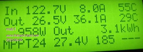 as the sun was headed west, i didn't get past 12A out, and was mostly <10A, but did notice the mppt seemed to be erring on the too-low voltage side c.f. what i would see from the gridtie inverter, sometimes way too low(Voc 154v, expected Vmp ~120 - 130, maybe 115 as light fades. Actually getting 109V at 10A out, dropping to 88v, but the odd 50v!).