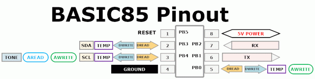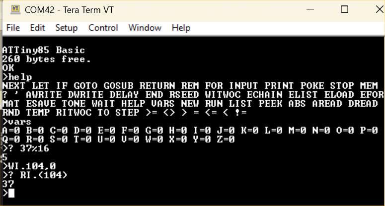 Here are a few additional thoughts about Tiny85 Basic for @matherp and the group to consider. Keep in mind these are only suggestions based on my current thinking and may not be practical or even possible. I'm just trying to anticipate simple ways to make the device more useful: The LET command is completely useless, and we don't need backward compatibility as this is a new project. We don't need REM as we can use ' if we actually have room for comments PEEK/POKE should possibly only work for the address range of the hardware registers? Perhaps the range of addresses could be shifted such that PEEK(0) would access the start of the hardware register address space? STOP seems redundant? How is it different then END? Do we really need ECHAIN? This implies that you have stored a program in EEPROM memory, which will run on reset by default, and then load another program by serial terminal that will then ECHAIN to the program in EEPROM? Seems like a very limited use case. Perhaps AWRITE could be expanded to allow a (potentially optional) parameter to set the frequency? Or perhaps AFREQ command to set the frequency? Or maybe add a PWM command as a slight variation of AWRITE? Otherwise we could use AWRITE to set up the hardware and then POKE the hardware registers to change the frequency? Some kind of PULSEIN command would likely prove useful as @Volhout suggests, but this may be a stretch given the limited resources. Please chime in if you have other suggestions based on your experience! -Carl |
