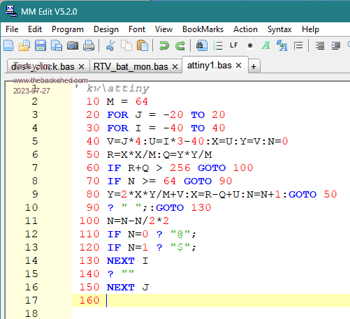 MMEdit is progresing well. Go from this: to this: and back again. You can edit in either mode. I need a few more sample programs to test with. Preferably ones that can be copied and pasted, not retyped. A question. Is there a preferred line ending? CRLF or LF alone and do the line endings count as characters? I will be happier once I have the chips and programmer in a weeks or two. Plenty of real life issues to keep me busy until then. Jim VK7JH MMedit |