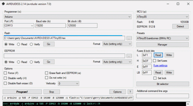 For those that don't like using the command line, I have successfully used this GUI front end for AVRDUDE. It sets all the fuses so just read them in before you set/change the ones you want to actually change. I did a portable install into a directory and placed the ATTiny85.hex in there as well. AVRDUDE GUI interface ![]() F4 H7FotSF4xGT |