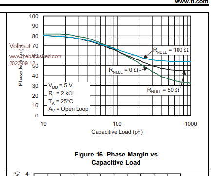 @Frank, For an opamp to be stable, it is preferred to have a phase margin of 45 degrees or more. Your opamp (TLV272) phase margin versus capacitove load shows that the maximum capacitive load is 300pF (the 0 ohm series resistor curve). 47uF is FAR too much. Your TLV272 opamp will not operate reliable. ![]() Additionally, if you plan to use the pico ADC is is best to use a LM4040 3V as reference at the VREF pin, and use a 1:1 voltage divider from that reference to create 1.5V. In that case they cannot drift appart. One reference for both. Volhout PicomiteVGA PETSCII ROBOTS |