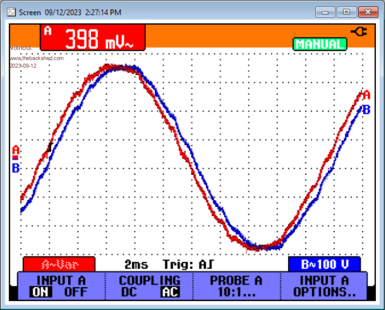 Hi Frank, You have not given any pass-fail criteria. Is it good enough ...? I cannot judge. You have put the zero crossing of both waveforms on top of eachother. - The second zero crossing is roughly 3/4 sampe period wrong (at 40 samples per sinewave is 6.7 degrees). - At this exact moment the amplitude difference between the 2 waveforms is almost 5% of the peak-peak amplitude. This will show up as harmonic distortion in the spectrum. If you run an FFT on the samples it gives you a number for the harmonic content. But the most important question is: Is the waveform the same as the actual mains waveform. The actual mains waveform may show the same distortion, or it may not.... Your transformer does not have to create a perfect sine wave, but it needs to be a good copy of the input signal. This is the input (blue) and the output (red) of my common mode choke circuit. The input is the 230V mains voltage. I used a scope with isolated input channels to prevent lethal voltages on the scope. ![]() Volhout P.S. the output is leading in phase, not lagging as I would normally expect... Edited 2023-09-12 23:30 by Volhout PicomiteVGA PETSCII ROBOTS |