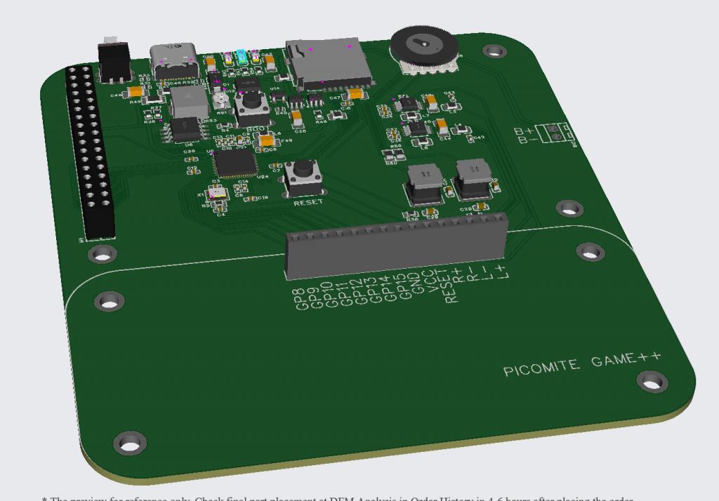 Tom Prior to the recent changes and implementation of CPU2 updates there is no question in my mind that an SPI screen would have been too slow for something like Petscii. The changes I've made make it more possible but there are compromises like blocking/crashing with sdcard access. If you consider a second SPI version I would definitely recommend to put the sdcard on different pins to the display. I'm sorry if you think I've trodden on your and Mick's toes. I do stuff just for the fun of it and to push things and my knowledge further (like having all the power circuitry and amp on board rather than using modules) and always then make the designs available free of charge and never sell anything. Having done the rp2040/flash circuitry on the VGA boards this is now a "module" I can incorporate on any design and know it will work with a defined set of components that I know JLC normally have in stock. I can now add a full battery supply module and amp to that. I hear what you say about the daughter board. I'm thinking about one for the speakers. Thanks for the offer on the PCB but it would only be used as another development board and I can mimic it reasonably enough for testing. One area where we obviously differ is that I now see no real use for through hole designs. The costs of having stuff made at JLC even in small quantities are so low that I don't think you can justify the time to solder up even a simple board like the GameMite. It also saves all the hassle of buying in components from multiple sources. If the design is right the boards arrive and work first time. |