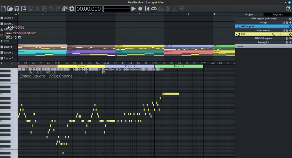 Does anyone have the experience and time to help me migrate VGM audio to MOD? I can provide the VGM files that can be opened on FamiStudio, which provides the song notes and effects from the two used audio channels. Unfortunately, FamiStudio doesn't support exporting MOD files. The following image exemplifies the Knightmare stage 1 song in FamiStudio. |