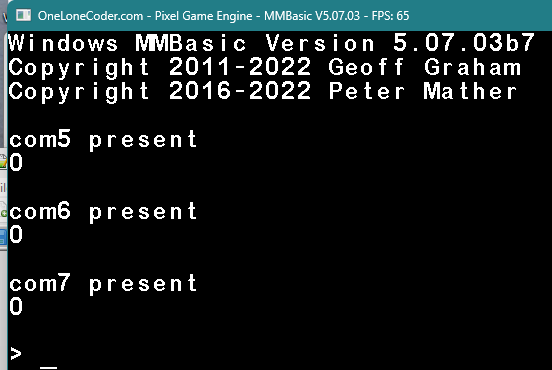 Thanks Jim, I tried that in MMBasic for DOS and MMB4W and the scanning code works well. I had no com ports used but plugged in my MM2 test/programming board and it was then found.