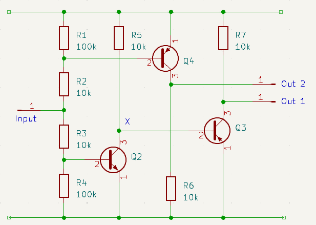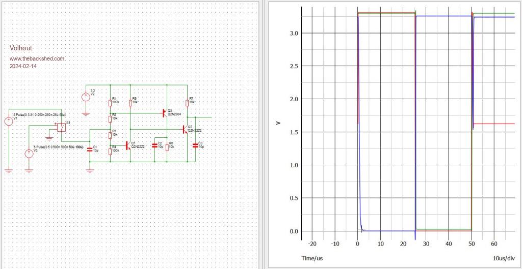 My second sketch works by turning both the first NPN and the PNP on when the pico output is floating. When it goes high it turns the PNP off, when low it turns the first NPN off. The signal at the collector of the first NPN is inverted by the second NPN.