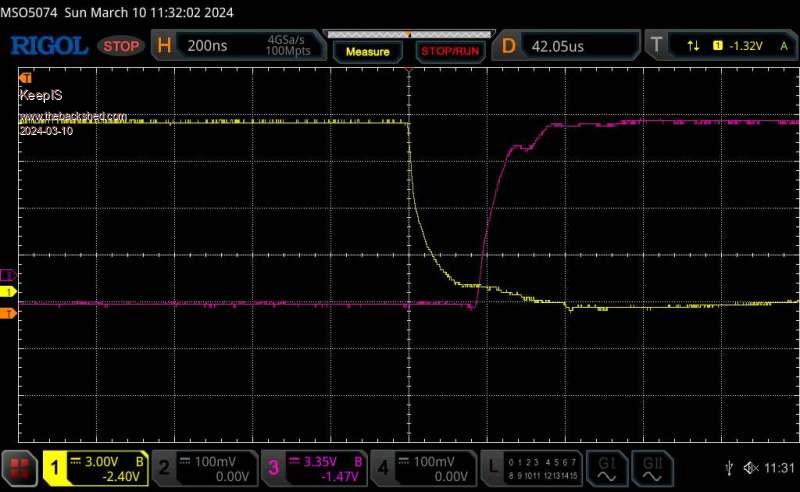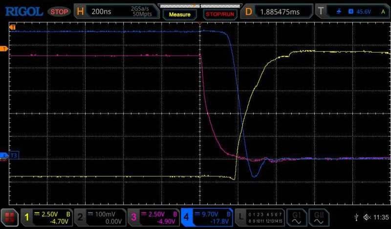 The original circuit has 100R series, the latest one from you has 120R and with a 1nf cap and 5V is around 123nS, 4KW Nucleo PWR R2 Circuit.pdf from early 2003. BTW That also shows the upper ferrite beads removed. This was basically measured across the resistors (R26, R28) gate drive IE: Before the 2R2 - that's means the thin PCB gate drive track. Not directly across the FET D and S. Edited 2024-03-10 12:44 by KeepIS NANO:Inverter V 8.2ks - Linux AvrDude GUI script V4.1 |
