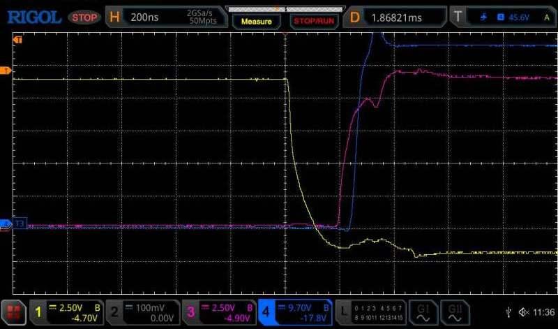 Mike is that measured at the gates or the actual rise and fall of the FETs ? I am assuming gates ? Perhaps adding another 50nS would not hurt anything and give a little more breathing space, that looks a bit tighter than expected ? To clarify for others my definition of dead time is roughly the time taken between say the gates of the upper FET turn off and the Lower Fet turn on, and vice versa. But the FETs have a delay and fall and rise time - it is possible for the gate waveforms to look about right but the actual Drains on or off from the conducting state may be quite different causing the "dead time" to actually be reduced. I used 1n5 caps in mine and with the 240R total in series it calculates to ~ 300nSecs. I dont have any screen shots to refer to though and dont remember what it was, I will look again in due course. Having too much fun with the paperwork ![]() If at first you dont succeed, I suggest you avoid sky diving.... Cheers Mike |