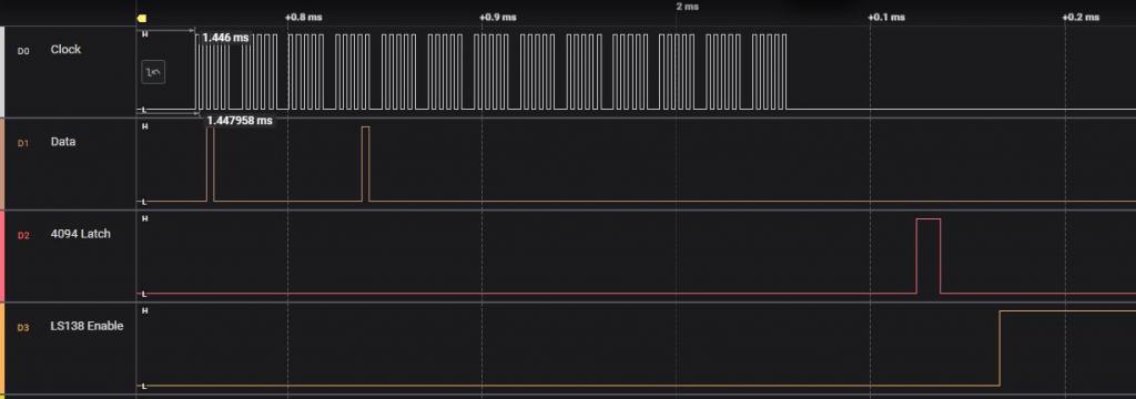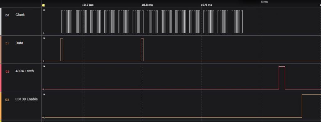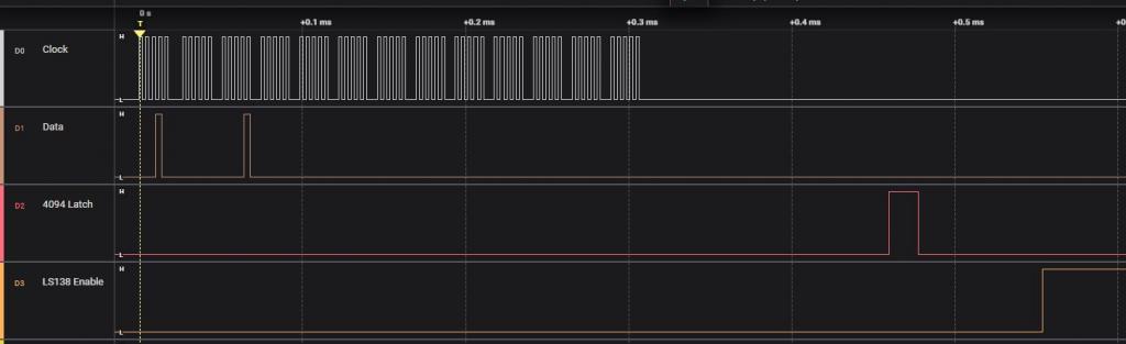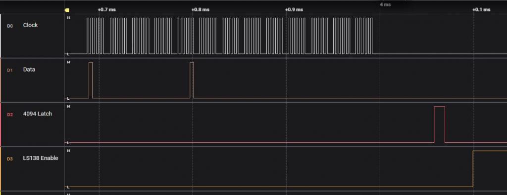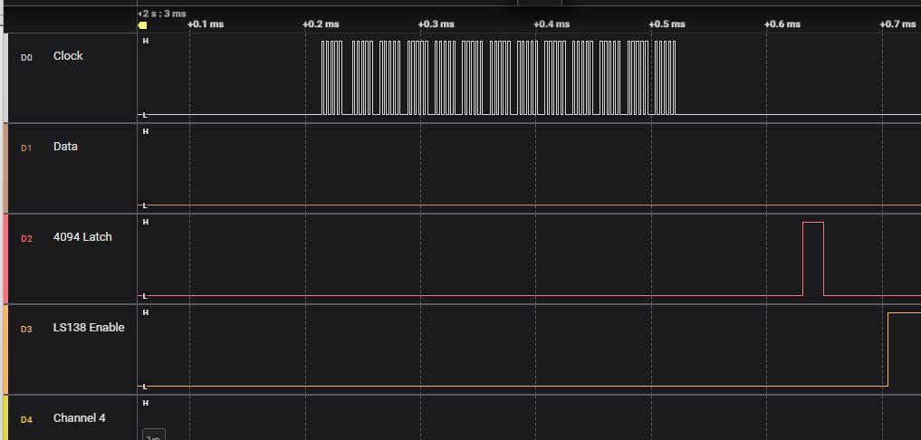 @Volhout, I've made those changes, but it isn't working i'm afraid, this is what I have now. '4094 driver, running on picomite GEEK unit option default integer Const LS138Enable = MM.Info(pinno gp1) ' enable to the LS138 'SPI channel setpin gp16,gp3,gp2,spi 'gp2=clock, gp3=tx , gp16 is not used 'CD4094 shifts on rising clock edge, input data must change on falling edge. SPI OPEN 200000,0,5 '200kHz data output falling edge, 8 bits SetPin LS138Enable, DOUT setpin gp5,dout 'latch enable signal pin(gp5)=0 '0=hold data 'this is the array holding all the pixel data for the LED's dim txt_out(12,6) filltextarray 'this is the array that us used by SPI to send out data dim row_out(12) 'this is the interrupt that multiplexes the display settick 2,nextrow 'here comes the main code, text entry, scrolling, serial input etc... do 'do all the stuff pause 100 'just to simulate stuff... loop 'This is the display multiplexer sub nextrow Pin(LS138Enable) = 0 static i=0 'static = local i inherits last value inc i,1:if i=7 then i=0 'next row math slice txt_out(), ,i ,row_out() 'copy into single dimensional array spi write 13,row_out() 'send it out pulse gp5,0.01 'latch enable pulse Pin(LS138Enable) = 1 ' enable the row 'port(x,7)=row(i) 'drive rows starting GPx, 7bit wide end sub 'just to get the pixels in the DATA statements into an array sub filltextarray for i=0 to 6 for j=0 to 12 read txt_out(j,i) next next end sub 'some default text, each bit is a LED in 5x7 'row 1 data &H01,01,00,00,00,00,00,00,00,00,00,00,00 'row 2 data &H02,00,01,00,00,00,00,00,00,00,00,00,00 'row 3 data &H04,00,00,01,00,00,00,00,00,00,00,00,00 'row 4 data &H08,00,00,00,01,00,00,00,00,00,00,00,00 'row 5 data &H10,00,00,00,00,01,00,00,00,00,00,00,00 'row 6 data &H20,00,00,00,00,00,01,00,00,00,00,00,00 'row 7 data &H40,00,00,00,00,00,00,01,00,00,00,00,00 I've added the first byte in the data table as the byte that selects the Row from the LS138, playing around with the bit's in the first byte, it isn't clear at the moment what is wrong, but these are screenshots from 'Logic' for the first 4 row data. I've changed the data in the table too so I can see where the relevant bits are in the analyser display. Row 1 Row 2 Row 3 Row 4 I can send you the captured data if you use Logic by Salae (which I think your screenshot was from). Tony |