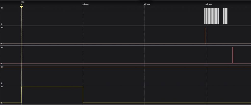 I just tried the data lines you sent, I get nothing recognisable on the display, ![]() I think there still maybe something wrong in the shift / math bit. If I set the data bytes to all 0 including the first byte which selects the row, that should clock all zeroes to the display. I've set a trigger pulse at the start of the code to trigger the analyser, then captured clock, data and 4094 latch. For some reason I am seeing a '1' on the data line, but the data does'nt have any 1 bits set for the first row. Top trace is clock, next one down is data and the next one down is the 4094 latch, the bottom one is the 1mS pulse to trigger the analyser. This is the code that produced that capture. '4094 driver, running on picomite GEEK unit option default integer Const LS138Enable = MM.Info(pinno gp1) ' enable to the LS138 'SPI channel setpin gp16,gp3,gp2,spi 'gp2=clock, gp3=tx , gp16 is not used 'CD4094 shifts on rising clock edge, input data must change on falling edge. SPI OPEN 200000,0,5 '200kHz data output falling edge, 5 bits SetPin LS138Enable, DOUT setpin GP15, DOUT ' a trigger pulse for the analyser setpin gp5,dout 'latch enable signal pin(gp5)=0 '0=hold data Pin(LS138Enable) = 1 ' enable the rows 'this is the array holding all the pixel data for the LED's dim txt_out(12,6) 'this is the array that us used by SPI to send out data dim row_out(12) filltextarray 'this is the interrupt that multiplexes the display settick 2,nextrow pulse GP15,1 ' a trigger pulse for the analyser 'here comes the main code, text entry, scrolling, serial input etc... do 'do all the stuff pause 100 'just to simulate stuff... loop 'This is the display multiplexer sub nextrow 'Pin(LS138Enable) = 0 static i=0 'static = local i inherits last value inc i,1:if i=7 then i=0 'next row math slice txt_out(), ,i ,row_out() 'copy into single dimensional array spi write 13,row_out() 'send it out pulse gp5,0.01 'latch enable pulse 'Pin(LS138Enable) = 1 ' enable the row 'port(x,7)=row(i) 'drive rows starting GPx, 7bit wide end sub 'just to get the pixels in the DATA statements into an array sub filltextarray for i=0 to 6 for j=0 to 12 read txt_out(j,i) next next end sub 'some default text, each bit is a LED in 5x7 data &B00000,00,00,00,00,00,00,00,00,00,00,00,00 'row 2 data &B00010,00,00,00,00,00,00,00,00,00,00,00,00 'row 3 data &B00100,00,00,00,00,00,00,00,00,00,00,00,00 'row 4 data &B00110,00,00,00,00,00,00,00,00,00,00,00,00 'row 5 data &B01000,00,00,00,00,00,00,00,00,00,00,00,00 'row 6 data &B01010,00,00,00,00,00,00,00,00,00,00,00,00 'row 7 data &B01100,00,00,00,00,00,00,00,00,00,00,00,00 And the matrix looked like this ![]() I took out the enable to the LS138, I am now seeing the artifacts on the bottom row you can see in the picture, if I have the lines back inf or the LS138 enable, the artifacts disappear. Tony Edited 2024-03-18 19:39 by 58kk90 |