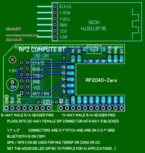 So, that's a ESP8266-01S version done. RPZ COMPUTE ESP Has a RP2040-Zero with a ESP8266-01S wireless modem module connected to COM1. The ADC connector and GP11-GP14 are omitted. GP15 is connected to the INT signal. Buttons are provided for the RST pin and IO0 to assist with programming.IO2 is brought out on GP11 pin of the module and IO0 on GP12 pin. If anyone wants any of the modules in this series, or would like me to produce another version, please let me know. I'm not publishing further design details at the moment as I'm still playing (as you may have noticed...). :) I'm considering putting four modules together on a single PCB so that one order will get you five of each. Probably the original, VGA, BT and ESP but I'm open to any ideas. Unfortunately I can't really get any more than four on - and you'll need to cut them, although JLCPCB would almost certainly cut the notches for the RPX2040-Zero. Mick Zilog Inside! nascom.info for Nascom & Gemini Preliminary MMBasic docs & my PCB designs |
