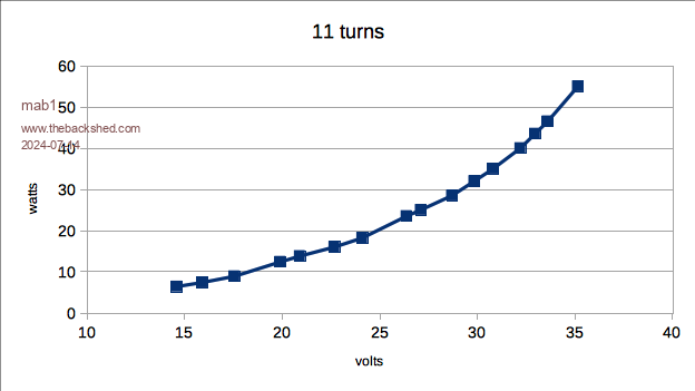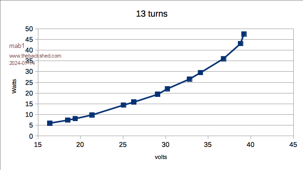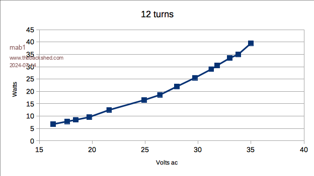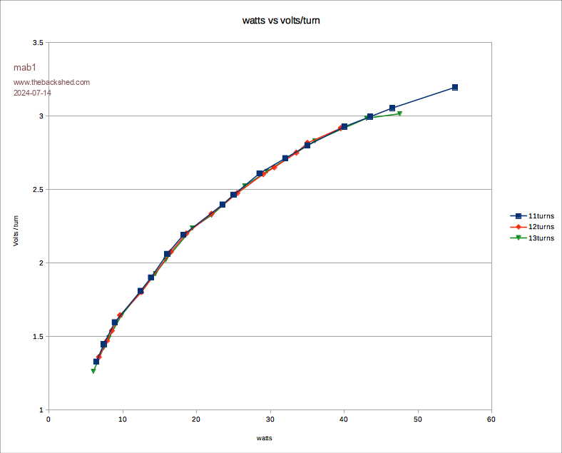 Thanks . I may try and find some pulley sheaves like yours for straightening - not done anything with the kinky wires yet. Ah yes your wire grab tool: i did see that, and was wondering if i could make something like it out of wood - though i was thinking of being able to stop and rest my fingers without my windings unravelling .As for twisting wires together - I think I'll wait to see how the secondary goes on first. I was thinking about winding a test primary on the double stack when i realised I'd made a glaring error when i thought my secondary would be 61T on the double stack:- 61T would mean 4v per turn and a primary of 6 or 7 turns? For 48v? Wiseguy was estimating double that! But I've worked out where I went wrong: i was thinking 121 turns on a single core = 61 turns on the double, but i was forgetting that 121 turns gives me 115v per core, and series connecting them in a keepIS stack for 230v. If i want 230v from my double core i still need 121 turns , or thereabouts.So I've done some variac measurements: ![]() And even made some fancy charts:- ![]() ![]() ![]() Then i realised i was just duplicating the same data: so i put it all on one chart scaled in volts per turn. ![]() There's the odd dodgy result:- the diversion controller was turning the 3kw immersion on and off and if it switches between my reading the wattmeter and the voltmeter there'll be an error (if only i had a variac that didn't vary it's output volts with input ) |