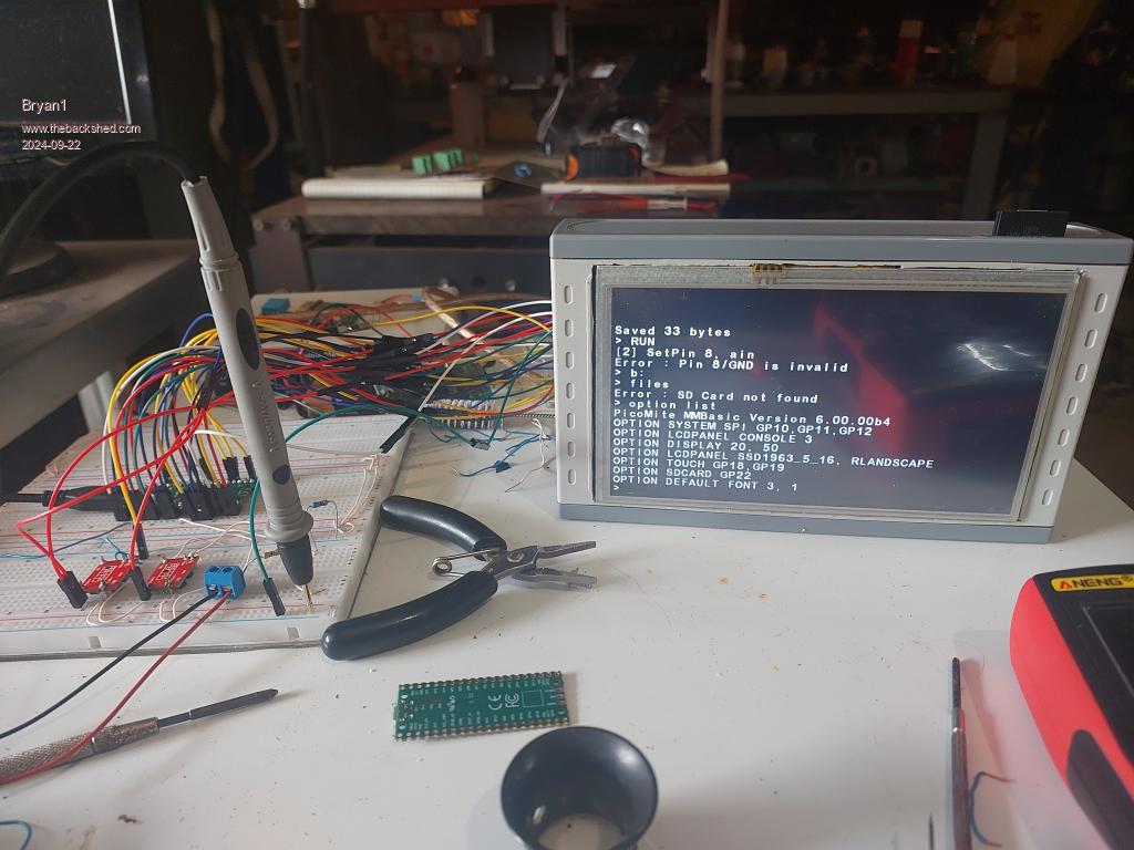 Well found some time yesterday to get this all wired up and noway would the lcd work So thought just leave it for the next day and try again. Well this morning YAY the LCD lives and found yep the cursor was a small font and upside down so reset the pico and changed the setting only to find the pico led stopped and lost connection on com14. So reloaded V6 after doing a clear flash and found the lcd was a blue font and placed 1/2 way down the screen so changed the setup again only to find the same problem and the third time it did look the same no LCD output then as soon as I set the touch pins the LCD came to life. ![]() Still need to sort out the SDcard as it wasn't found and decided to do a simple code to read GP8 where I used the simple code out of the manual setpin 8, AIN print pin(GP8) and got the error shown. Got a 10K/4.7K divider and GP8 has 2.5 volts on the pin so why this simple code won't work and soldered pcb pins to those buck regualtors so they fit on the breadboard. Also found as I provided 5 volts to the LCD I had to connect LED_A to 5 volts to get the back light to work. So more fun is on the way as I try and get this setup Regards Bryan Edited 2024-09-22 11:36 by Bryan1 |