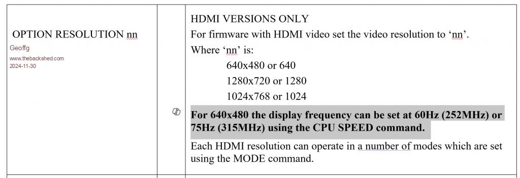 Geoff: another trivial one OPTION RESOLUTION 640/640x1280 [,252000/315000] In the case of HDMI 640x480 you can choose the display frequency 60Hz (252MHz) or 75Hz (315MHz) Also in then acknowledgements: "The CRC calculations are copyright Rob Tillaart" |