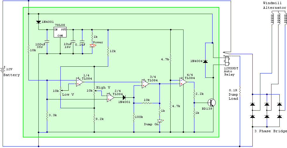It works fine as a easy to set up windmill controller, and can be used as a shunt or diversion controller. This one is set up for 12v, the trimpots let you adjust between 11v and 16v, more than enough range for a 12v battery. I'll put a web page about the controller on the website in a few days, with modifications for 24v and 48v operation. I also have a veroboard layout. The same circuit could also be used for solar and as a low voltage cut out. Glenn The best time to plant a tree was twenty years ago, the second best time is right now. JAQ |