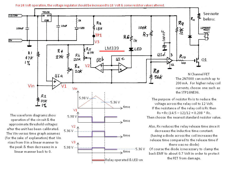 Circuit description. The LM 339 is a quad voltage comparator with open collector outputs. Comparator U1a is configured as a Schmitt Trigger; it has hysteresis due to positive feedback via Ra and R4. The positive going threshold is set by R5 and Rb (the output of U1b is low because Vin is below the threshold since the output of the U1a is open). The negative going threshold is set by Ra and R4. Thus there is no interaction when adjusting Ra and Rb. The supply voltage is divided the voltage divider formed by the resistors R1 and R2. When the voltage at the top of resistor R1 reaches about 14.5 Volt, the voltage Vin will be about 5.98 Volt which is the upper threshold of the of the Schmitt Trigger. The voltage at the output of U1a, will fall rapidly due to the positive feedback to approximately 0 Volt. The other 3 comparators are referenced to about 2.9 volt due to the voltage divider formed by resistors R7 and R8. Therefore the outputs of these 3 comparators will change as the voltage V1 passes through 2.9 volt. The output of U1b will go high and the output of U1a will go low. Consequently the threshold level of U1a will change to about 5.36 volt. The output of U1c will go low & turn on the LED. The output of U1d will go high thus turning the FET Q1 on which operates the relay. When the voltage at the top of resistor R1 decreases about 13.0 Volt, the voltage Vin will be about 5.36 Volt which is the lower threshold of the of the Schmitt Trigger. Thus, V1 will go High, V2 will go Low; the LED will go & the relay will release. Hence the circuit will return to its initial state. Calibration Procedure. 1. Disconnect the top end of R1 from the 12 Volt line. 2. Measure the voltage at TP1 & adjust Rb until V3 = 5.98 Volt. This sets the upper threshold. 3. Connect a temporary 47 k resistor in parallel with R1 & connect their top ends to the 12 Volt line. 4. The relay should operate & the LED should light. 5. Now adjust Ra until V3 = 5.36 Volt. This sets the lower threshold. 6. Disconnect the resistors from the 12 Volt line & the relay should release and the LED should go off. 7. Remove the temporary resistor and re-connect R1 to the 12 Volt line. 8. The unit is now ready to operate. |