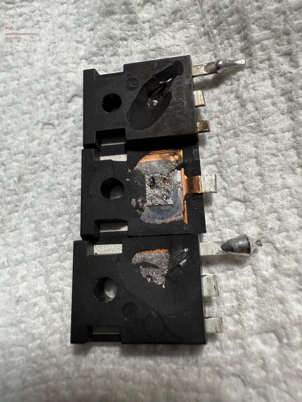 So, I started removing the blown mosfets using suction desoldering tool. And I added more damage by tearing the top side copper foil. Luckily, I can beef up the connection at the bottom side. To avoid further copper foil damage, I cut two adjacent legs of the mosfet (my small cutter can reach only two) so that I can easly desolder and pull the remaining leg. I will be replacing all 24 mosfets anyway. ![]() One pair of totem pole transistors also was damaged together with their solder pads. I will be replacing all four pairs. Note also the solder pad damage of the badly blown mosfet. ![]() Here is close up of three blown mosfets. The top mosfet shows one of the source terminal bond wire sticking out which measures roughly .013" (.33mm) dia. with a caliper. The bottom mosfet seems to show that there are two bond wires for the source terminal. And apparently their explosion caused the body to crack. |